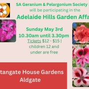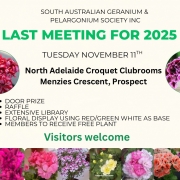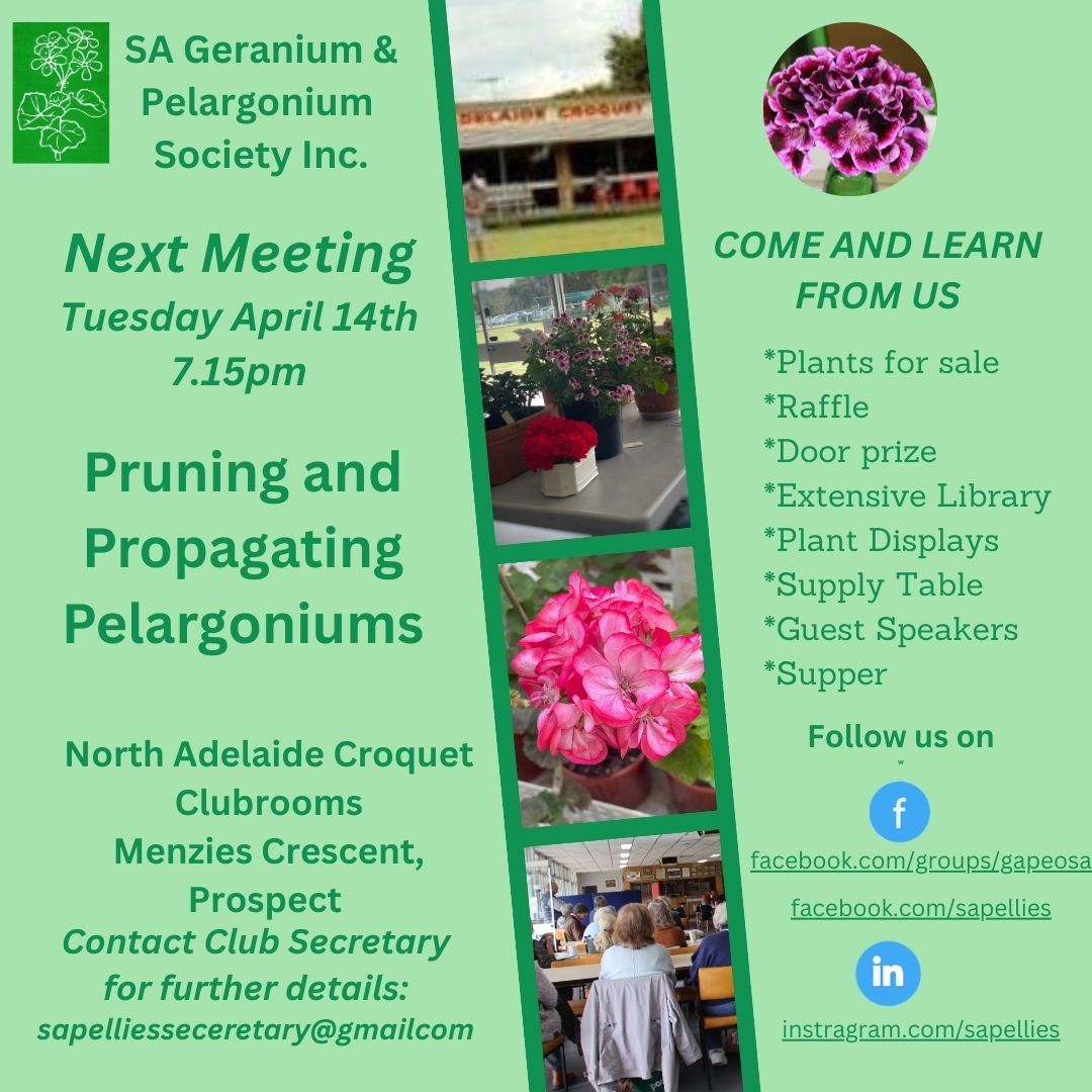 The next meeting for the Society will take place on Tuesday 14th April commencing at 7.15pm. A member will give detailed information about taking cutting and propagating pelargoniums which will include regals and zonals.