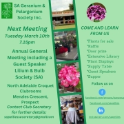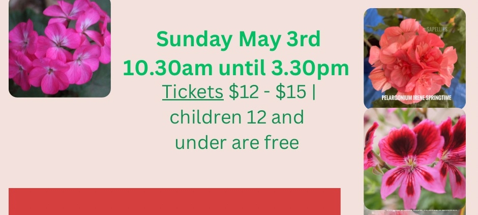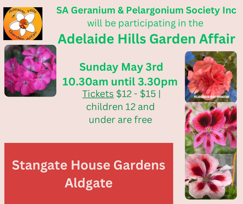 Do book your tickets to come along, not only to purchase some pelargoniums for your own collection, but to view the beautiful Stangate House and Gardens at Aldgate and support the Adelaide Hills Garden Affair.